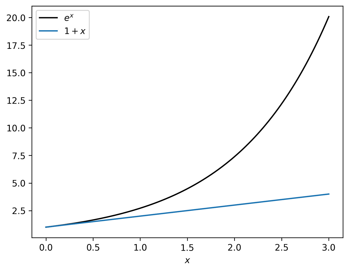 For the mathematically inclined, one way to understand this is via a Taylor series. If you look at the first plot in this essay, a linear function approximates the exponential at small values of x. However, we see that extrapolating this linear trend causes a huge underestimate of the exponential for larger x values. This is a clear visual reminder of the danger in thinking linearly about an exponential.